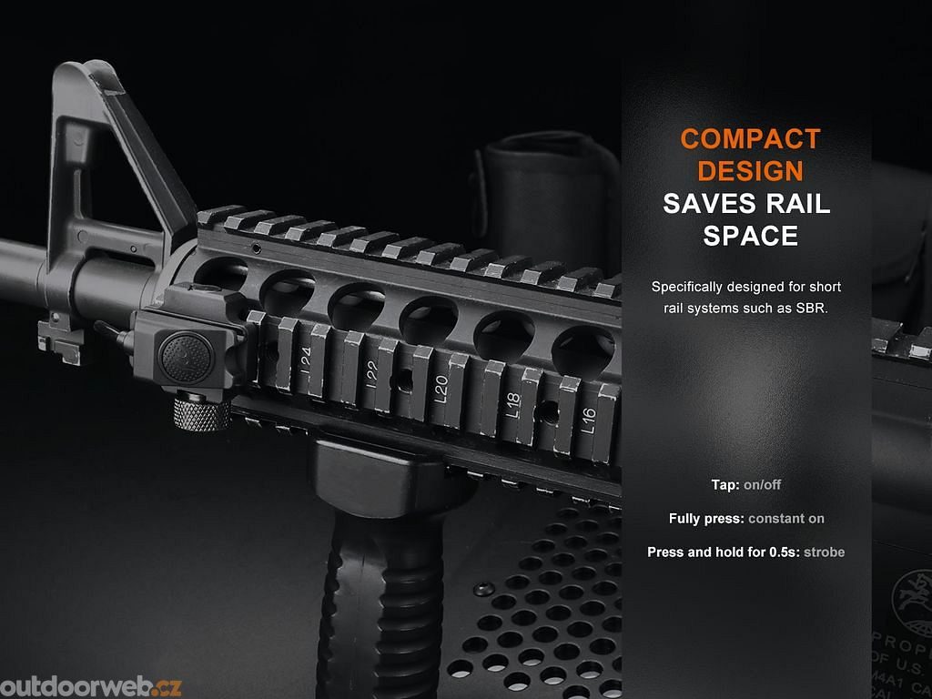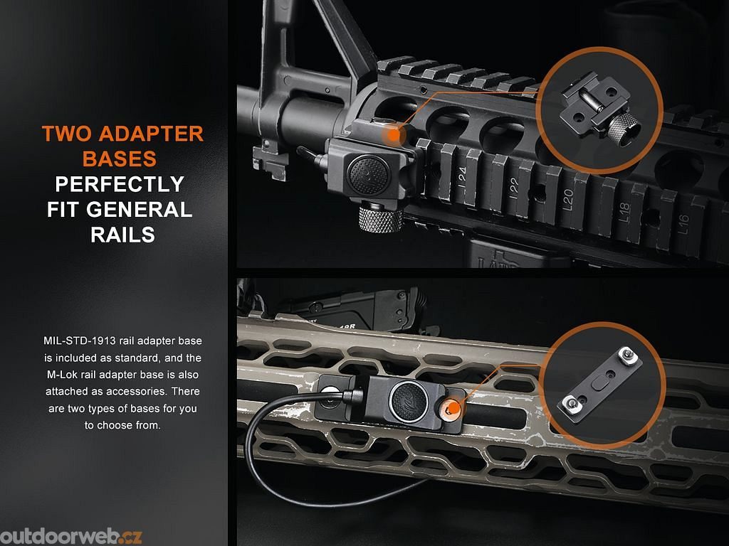 AER-06S tactical cable switch for Fenix GL19R flashlight for use with long gun mounted flashlight. The cable connects to the flashlight via the USB-C port. A noiseless button is located on the other end of the cable. The switch can be mounted on both the MIL-STD-1913 Picatinny weapon rail and the M-LOK interface thanks to the included accessories.