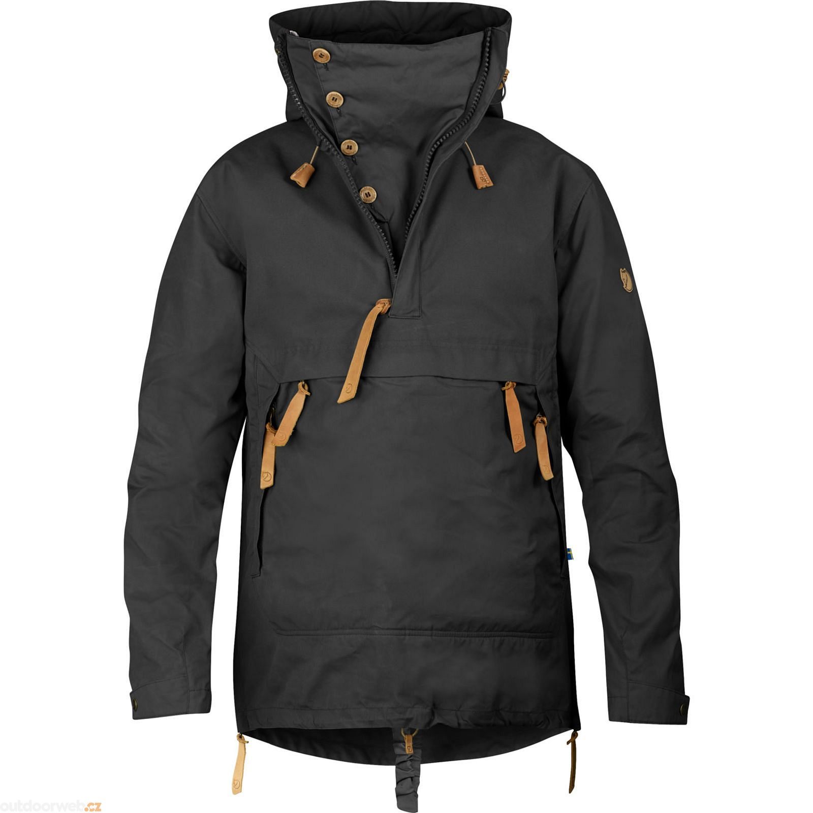 Anorak No. 8 was created to withstand tough conditions in the forest and mountains throughout the year. The hood can be adjusted for a perfect fit around the head, and a visor construction means that you can fold the visor back from two angles, depending on whether you want maximum wind protection or more peripheral visibility. When not being worn, the hood forms a high collar that keeps your neck warm. In warmer weather, the zipper can be unzipped and the opening unbuttoned and folded to the side to release excess heat. There are also long zippers in the sides of this anorak that can be opened for ventilation and make it easier to put on/take off. The large kangaroo pouch in the front can be accessed both from the top and the sides. A drawcord in the back regulates the waist and another drawcord in the front adjusts the hem. Buttoned sleeve cuffs. The anorak is made from wind and water resistant G-1000 Eco in recycled polyester and organic cotton with extra strong G-1000 HeavyDuty at the shoulders, sleeves and the extended back. The fabric and details were chosen to minimise their impact on the environment - for example most of the leather details are made from leftover pieces of leather - and to make it easy to replace exposed sections after years of use.
