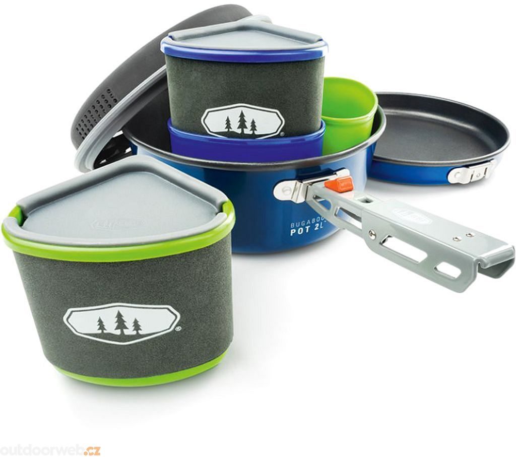 Contents: 2 l pot, 20 cm pan, drip lid, 2 420 ml cups with insulating sleeves, 2 420 ml bowls, 2 lids with drinking hole, foldable pot holder, welded sink bag