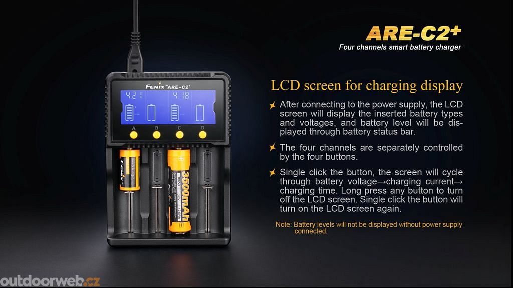 The Fenix ARE-C2+ universal four-channel charger is designed for both 3.7V/3.6V Li-ion and NiMH/NiCd batteries. Each charging slot is monitored independently so that batteries of different sizes, capacities and even different chemistries can be charged simultaneously (both Li-ion and NiMH/NiCd can be charged at the same time). The charger automatically detects the inserted battery type and selects the optimal charging algorithm.