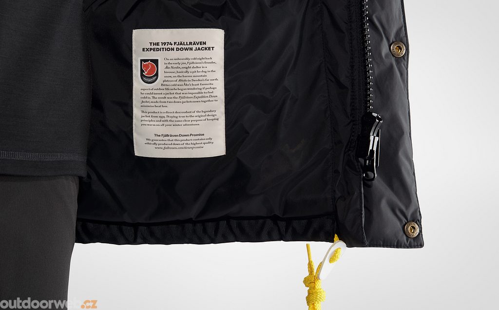 The model is also 8 centimeters shorter. Otherwise, it is exactly the same as the original: generous hood, yellow drawstrings, and spacious pockets. Reinforced with synthetic padding across the shoulders that resists moisture and pressure.