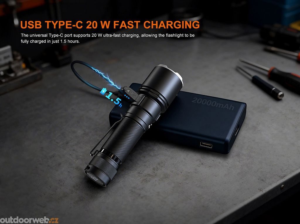 The typical charging time for a fully discharged torch is approximately 1.5 hours with a 9 V / 2.3 A (20 W) USB power source. The torch can be used while charging.