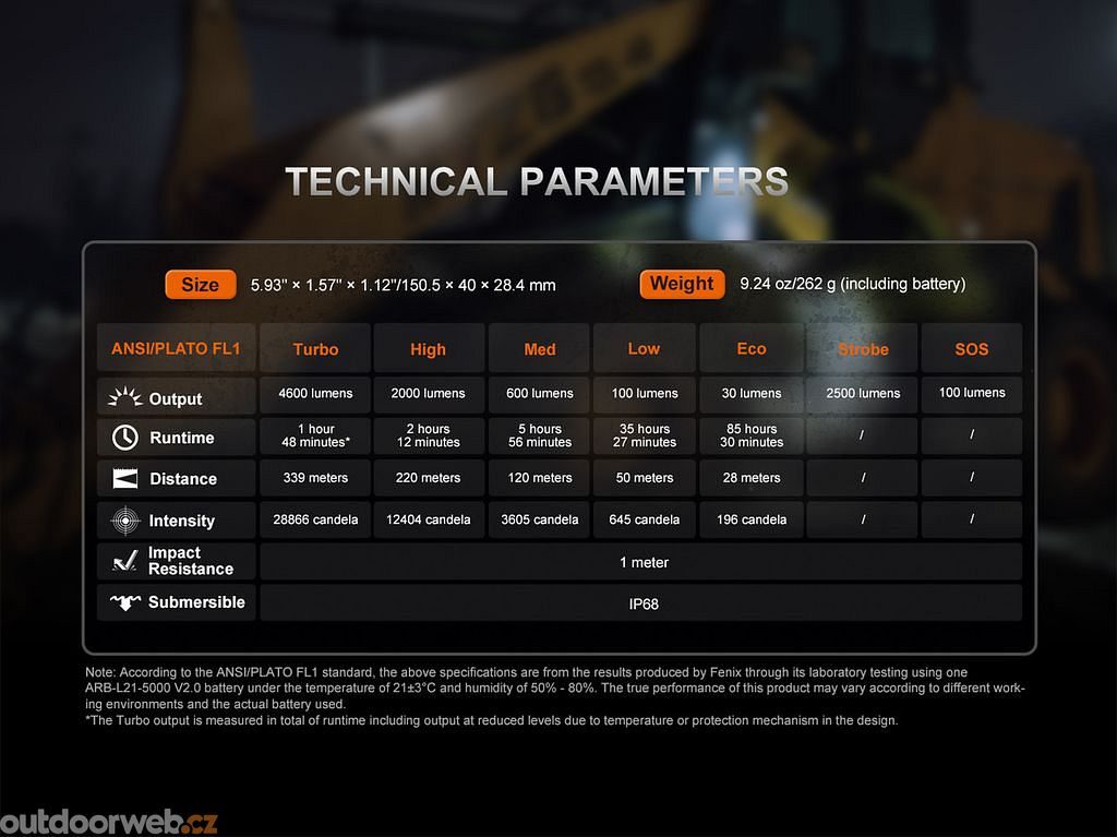 Light modes: 4600 lm (1:48 h) / 2000 lm (2:12 h) / 600 lm (5:56 h) / 100 lm (35:27 h) / 30 lm (85:30 h) / Strobe / SOS