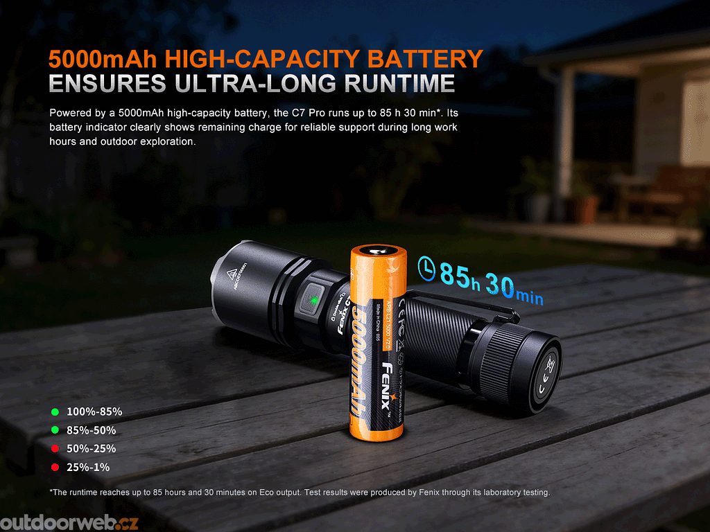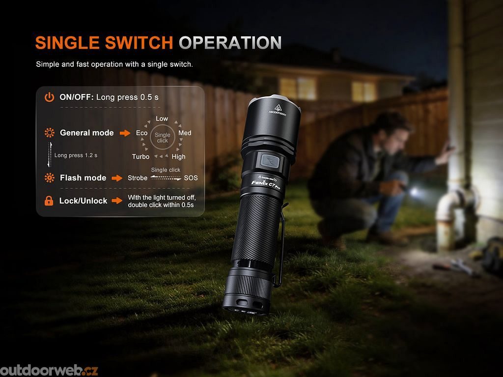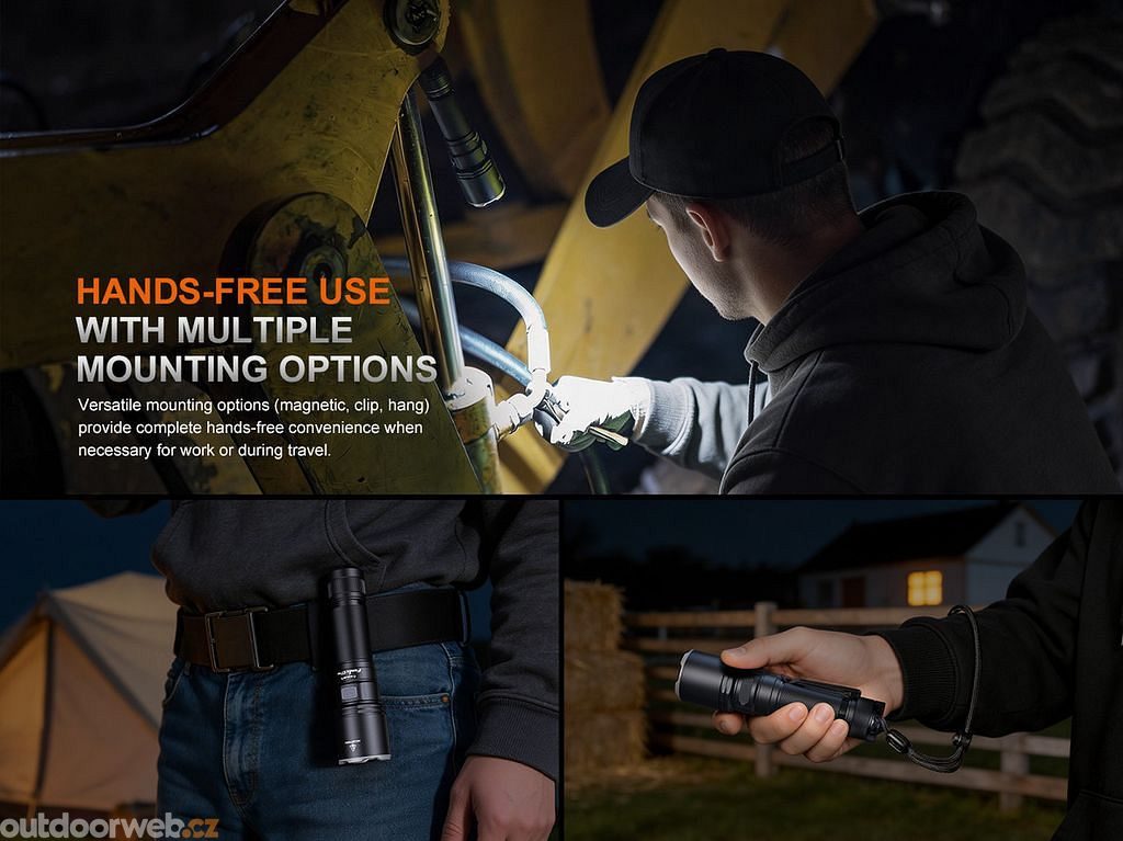 Four premium LEDs deliver an excellent light output of up to 4600 lumens with an incredible beam distance of 339 metres. Whether you work in industry or head out at sunset, the Fenix C7 PRO will always light the way. - Magnetic tail and no limitations in modes