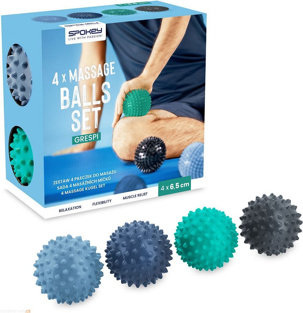 Massage balls GRESPI - set of 4 rehabilitation balls with different hardness and massage protrusions. Compact design for instant relief and regeneration anywhere.