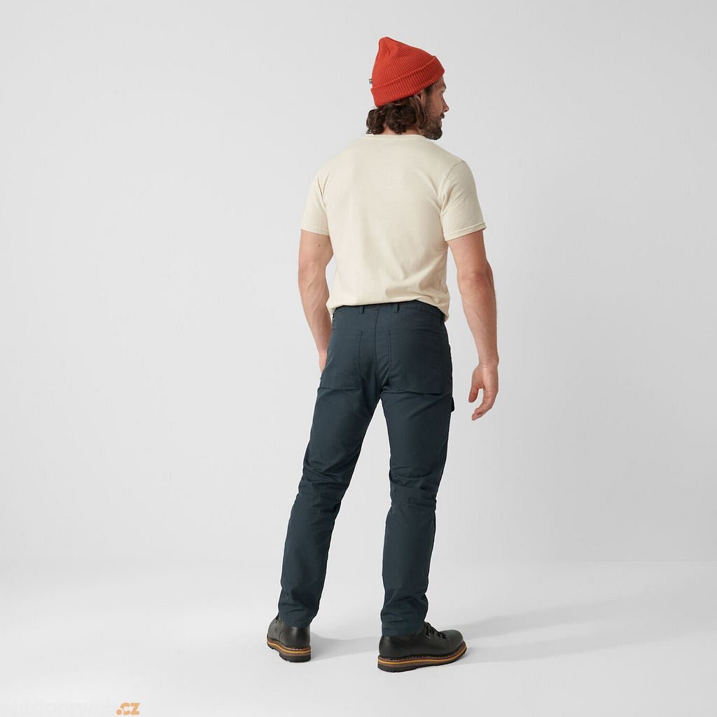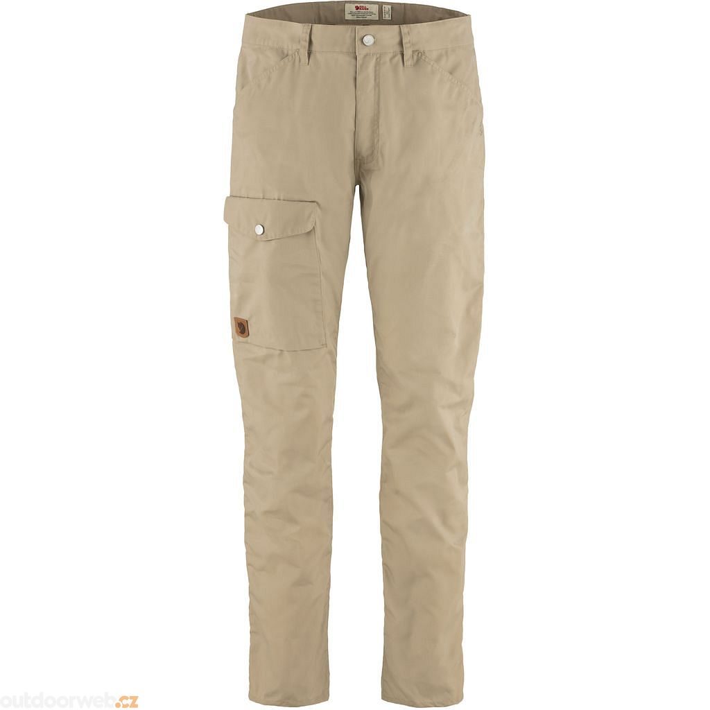Rubbery, quick-drying G-1000 Eco fabric. Regular fit with a tapered cut. Regular leg length. 65% recycled polyester, 35% organic cotton. Gusseted crotch for comfort and freedom of movement. Articulated knees. Leg pocket with flap and button. Two hand pockets. Coin pocket. Two back pockets. Wind and water resistant. Weatherproofing can be adjusted with Greenland Wax.