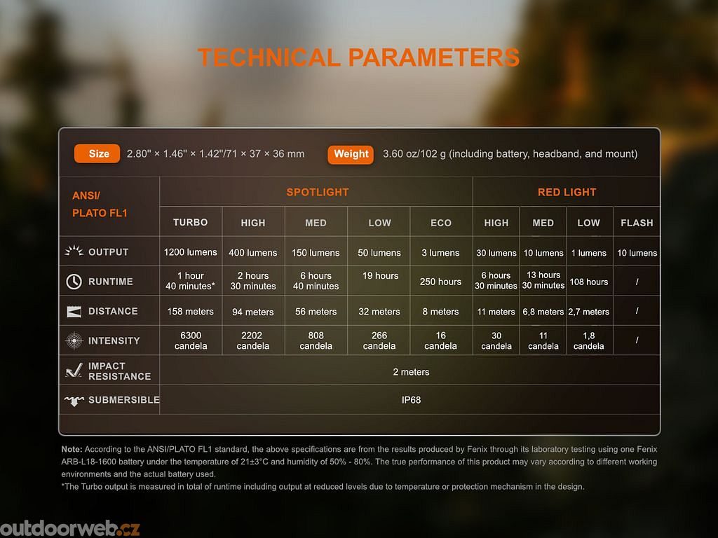 A powerful LED with neutral light (4500 K) provides up to 1200 lumens, excellent contrast, and a beam distance of up to 158 meters for maximum visibility in the field. - Maximum durability and versatile use