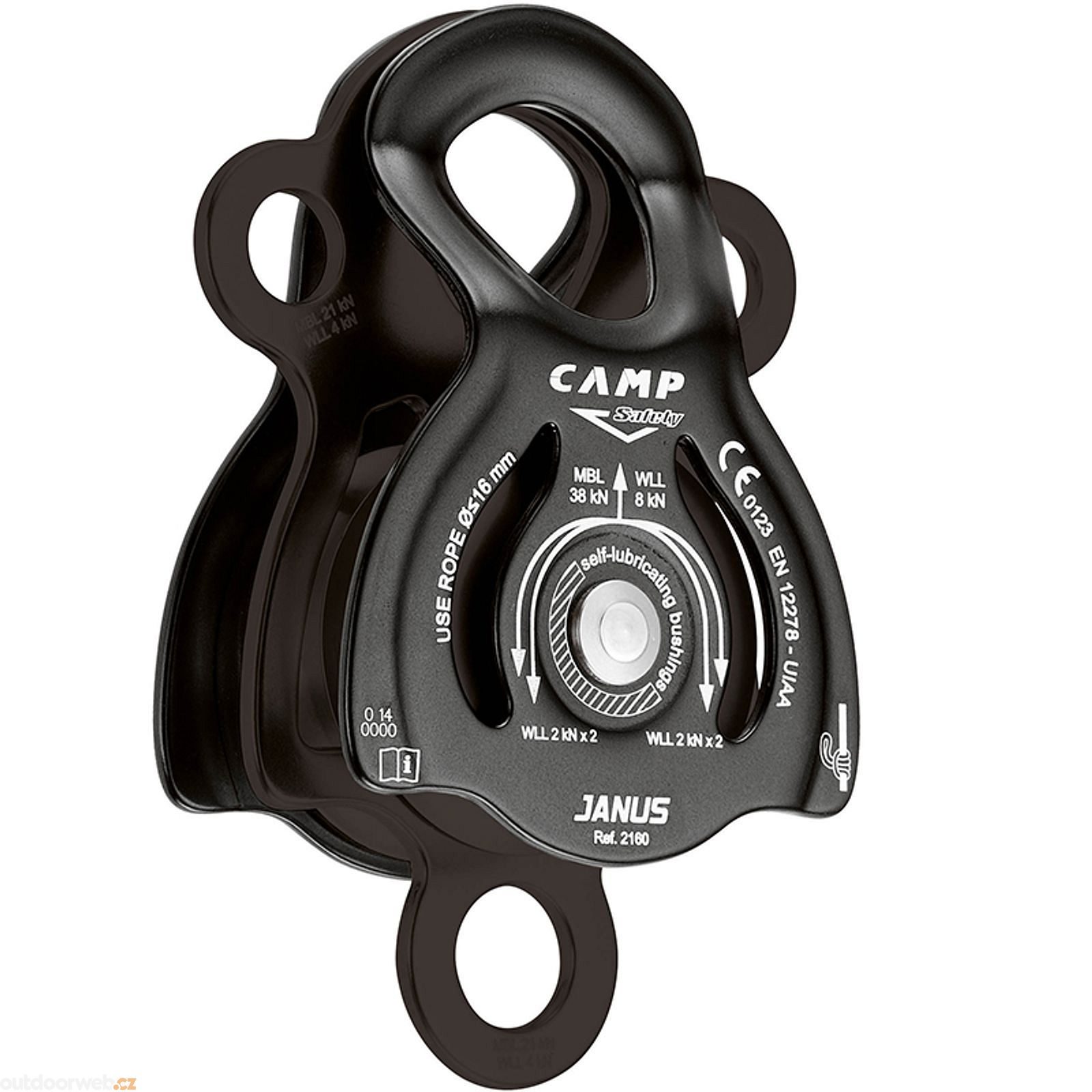 CAMP Janus is a multifunctional high efficiency double pulley with self-lubricating plain bearing and strength of 38kN. The pulley is suitable for easy connection to a hoist and is compatible with ropes up to 16mm. The CAMP Janus pulley with swivel side plates has an upper anchor hole sized for three carabiners, upper side holes for one carabiner and a lower connection hole also for one carabiner. Prusik auxiliary loops can be installed on either side of the pulley (we recommend the Aramide sling), which will be especially appreciated by emergency responders. The CAMP Janus is suitable for rescue scenarios and work use.