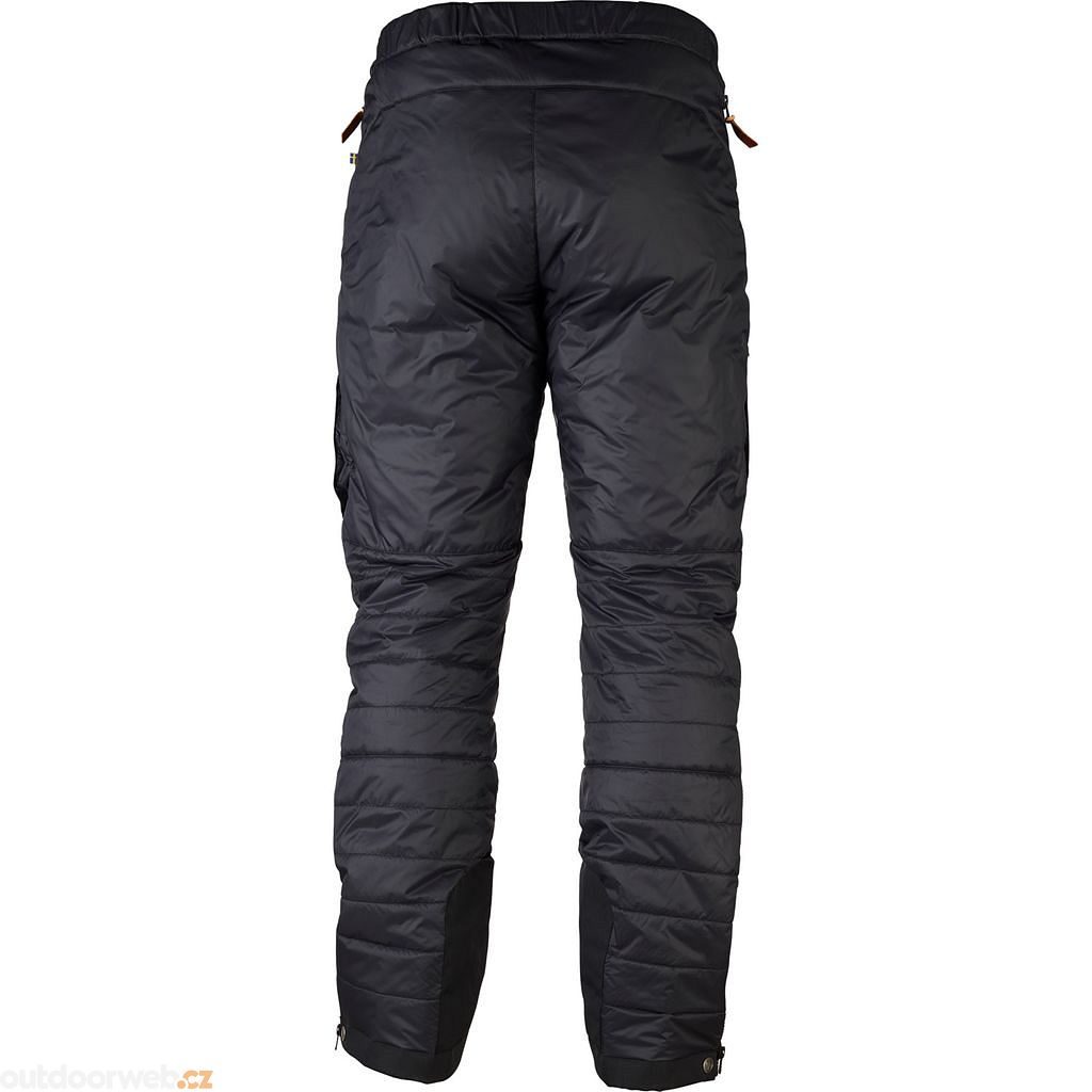 Flexible, water-resistant ripstop fabric. Double layer of fabric over the back. G-Loft Supreme filling. Articulated cut. Full-length side zippers. Elastic waist adjustment with Velcro and snap buttons. Zip and snap button closure. Leg pockets with flaps and Velcro closure. Zip pocket on left leg. Reinforced inner calves. Drawstrings at leg ends. Repair kit included.