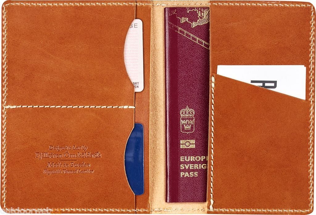 Two large compartments for passport and boarding pass and three smaller slots for credit cards or business cards. Fjällräven logo on the front. Handmade in our Swedish leather factory.