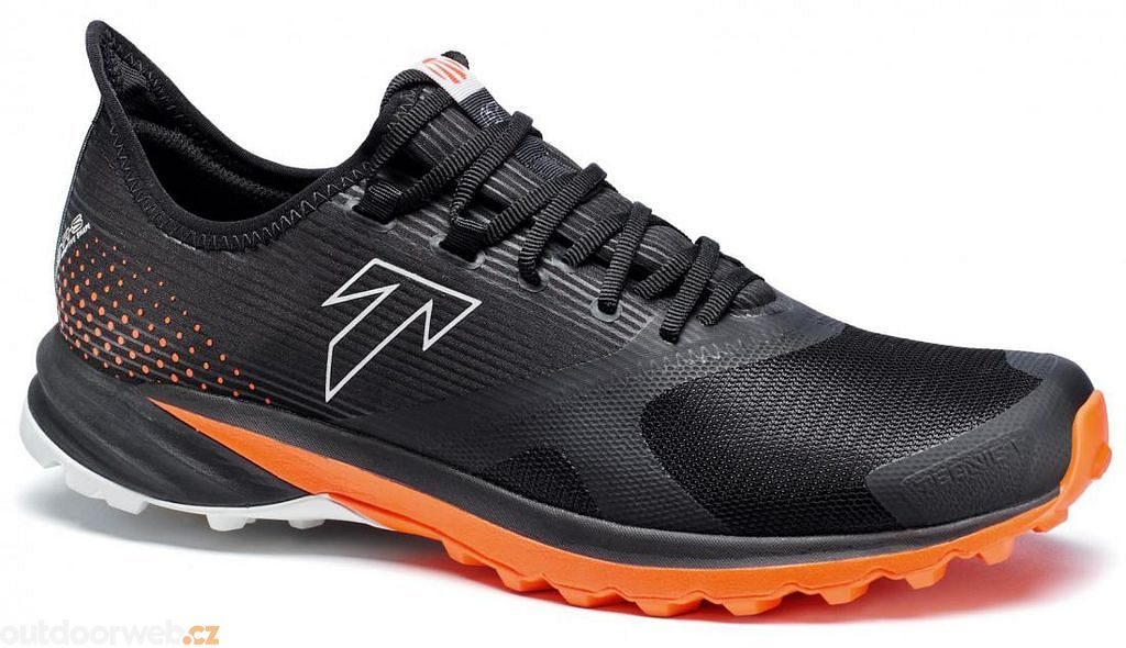 - Outdoor trail running shoes are black with orange detailing.