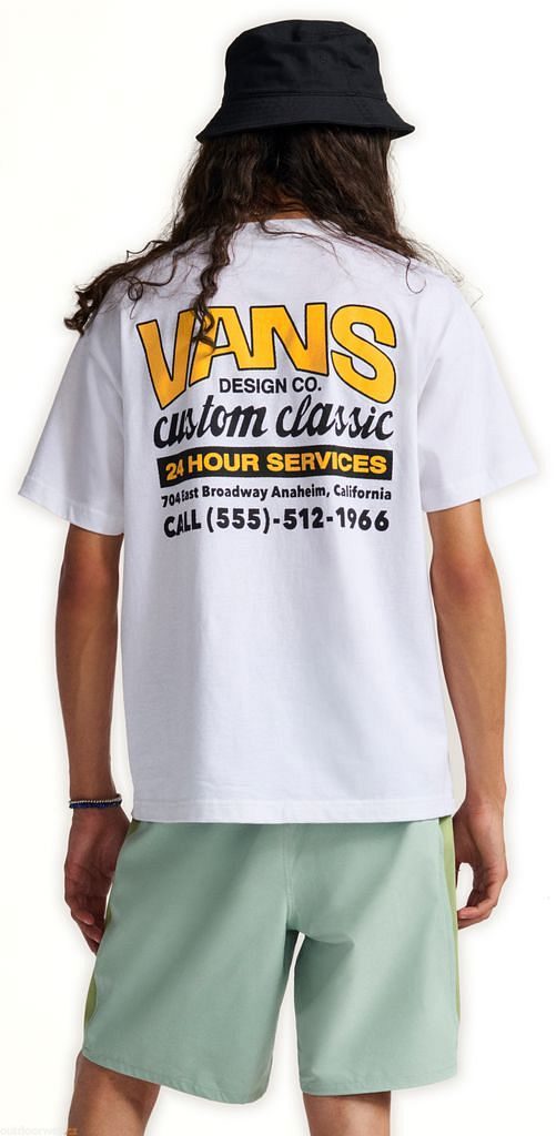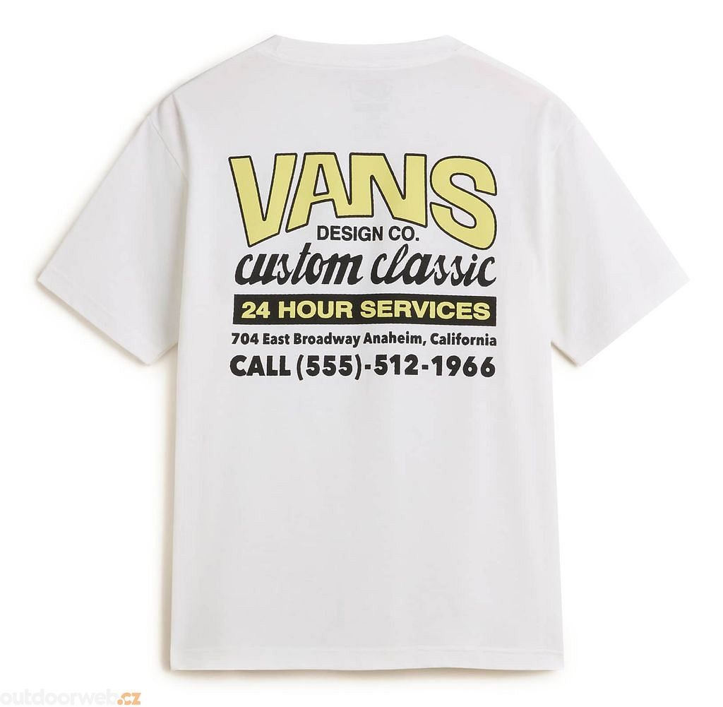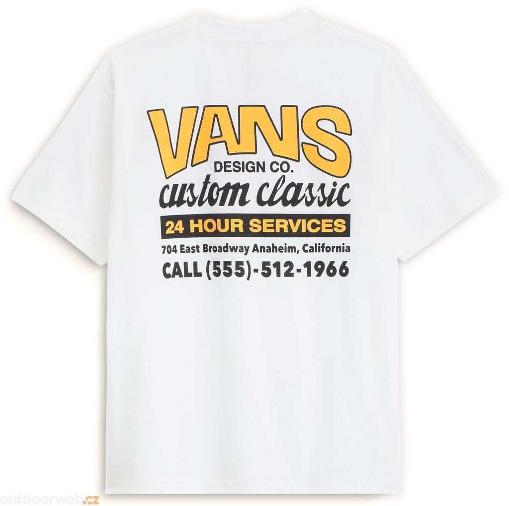 Wear a piece of Vans history in the Shop Front T-Shirt, paying homage to the company's first factory. This classic fit short sleeve crew neck T-shirt features a screenprinted graphic of a Vans® logo on the front, with a retro storefront ad of the factory's address on the back.
