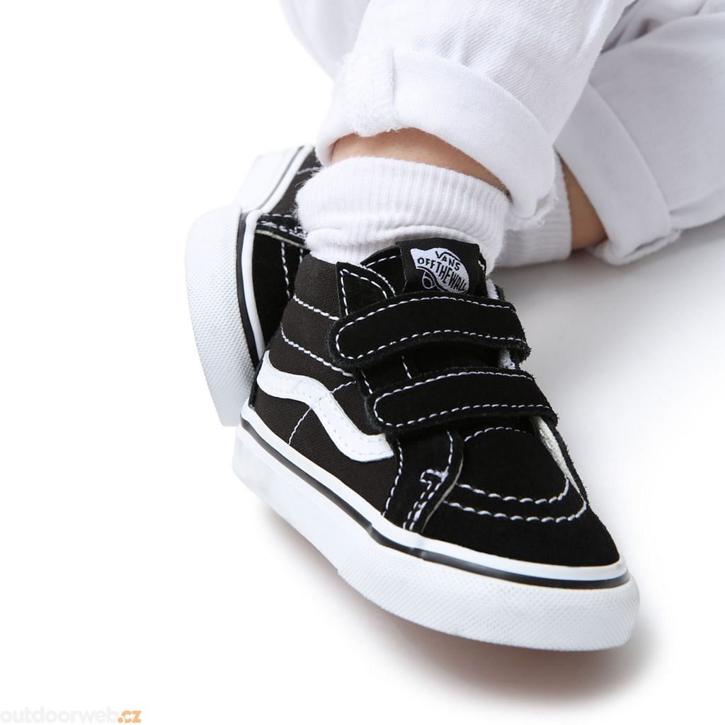 The Vans Sk-8 Mid Reissue V children's sneakers with Velcro closure have chunky suede uppers and a checkerboard print. Rubber waffle outsoles are a given.