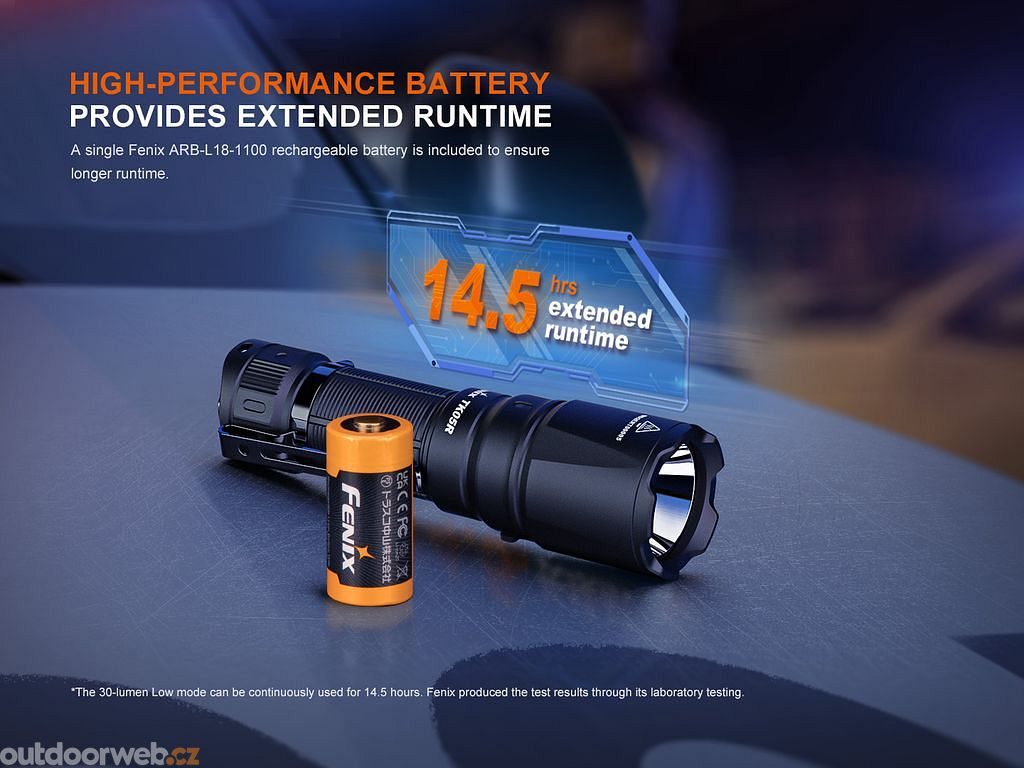 It is powered by a compact 18350 Li-ion battery with a capacity of 1100 mAh (included), which charges via a modern USB-C connector and provides up to 14.5 hours of operation. Water and impact resistant, this flashlight is designed for harsh outdoor conditions, and is ideal for security forces, search and rescue operations and hunting.