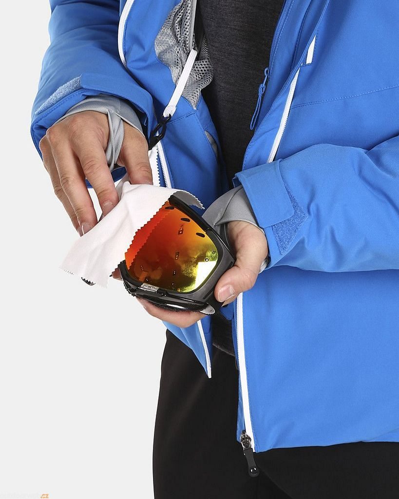 The jacket has several external and internal zippered pockets, including a ski pass pocket and a goggle cleaning cloth. - Stylish design: