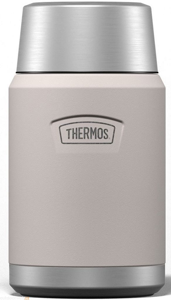 Stainless steel vacuum insulated food thermos with integrated spoon and 710 ml cup.