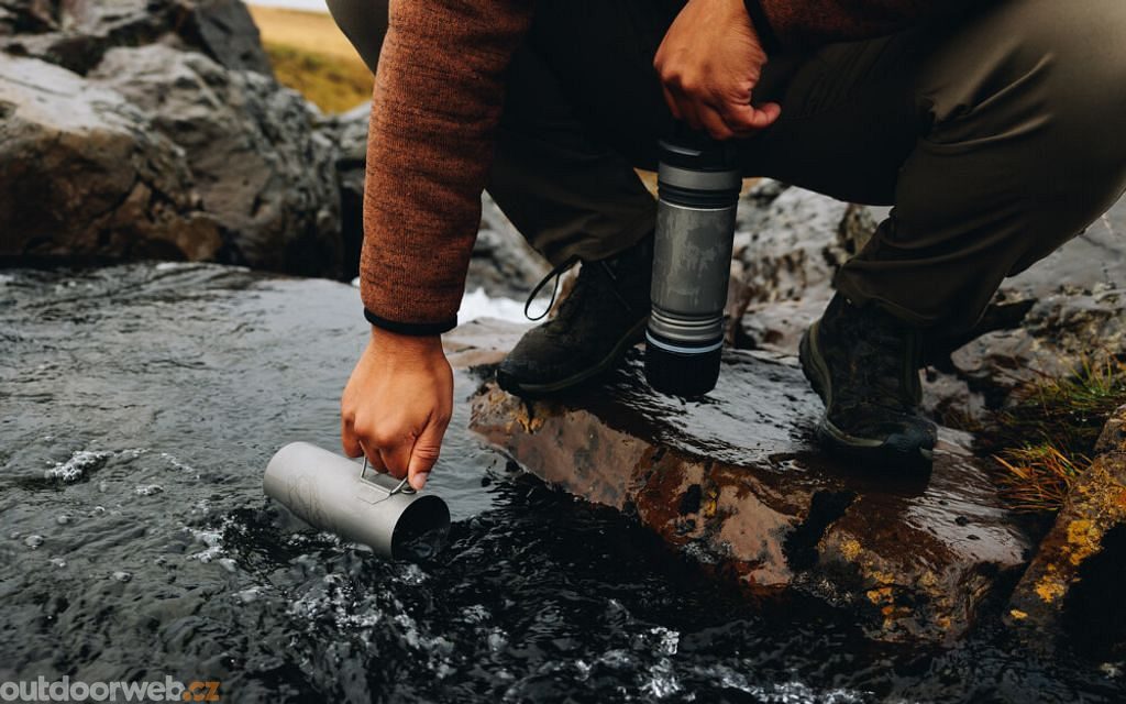 The Grayl Ultrapress Titanium Purifier is a filter bottle that provides you with unmatched versatility. It allows you to scoop water from the source, filter it in no time, carry it back to camp and cook it on a hiking stove or over hot coals. It is also the first filter bottle that allows the use of soluble drink mixes.