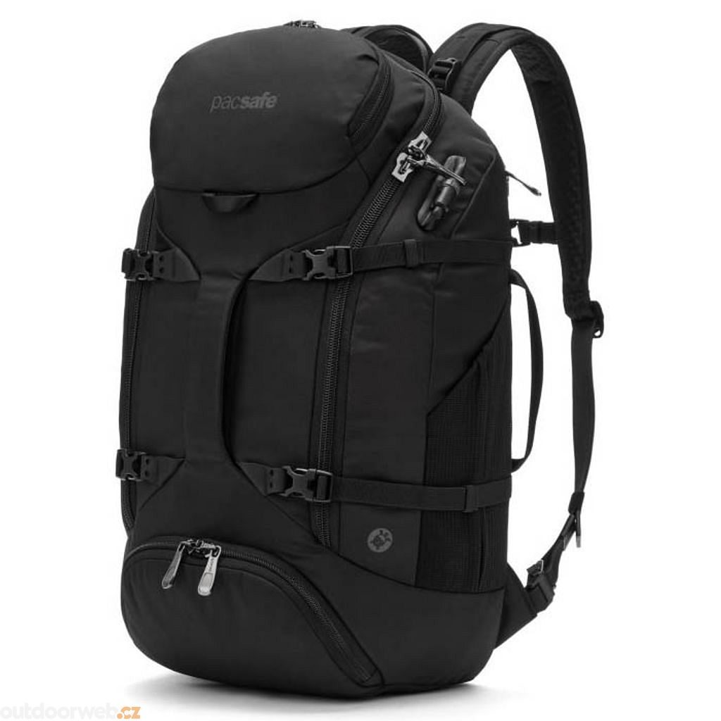 Flexibility in movement. Gym, travel, work, adventure - the world is yours with this versatile and spacious backpack. It features the latest Pacsafe anti-theft technology. Self-locking zippers, cut-resistant eXomesh lining, puncture-resistant lockable zippers, an RFID-blocking pocket and cut-resistant shoulder straps help keep your pack, its contents and your identity safe. This 35-liter anti-theft backpack holds a 16" laptop in a secret lockable back compartment. Pacsafe has the environment in mind when making it. That's because it's made from 37 recycled plastic bottles and the water-repellent finish is 100% PFC-free. The bottom pocket allows you to safely separate dirty shoes or wet towels. There are two large mesh bottle pockets on the sides. Attach your jacket, pad or perhaps a bike helmet with the external compression/attachment straps. The integrated vertical slip for luggage on the back makes it easy to slip the backpack onto your boarding luggage. The centrally located front handle makes it easy to handle.Dimensions: 52 x 25 x 20 cmWeight: 1.51 kgMaterial: 750D polyester, 1000 mm water column