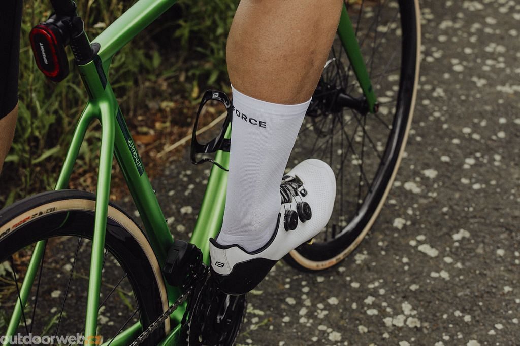 FORCE Verdone – professional cycling socks designed for performance. Premium FORCE Verdone knee-high socks combine Italian quality with a functional design focused on maximum comfort, support, and efficient energy transfer when pedaling. They are the ideal choice for demanding training sessions and races – developed in collaboration with professional cyclists. Technology for athletic performanceExtra compression material and reinforced sections support the foot and contribute to efficient power transfer to the pedals.Italian quality and style