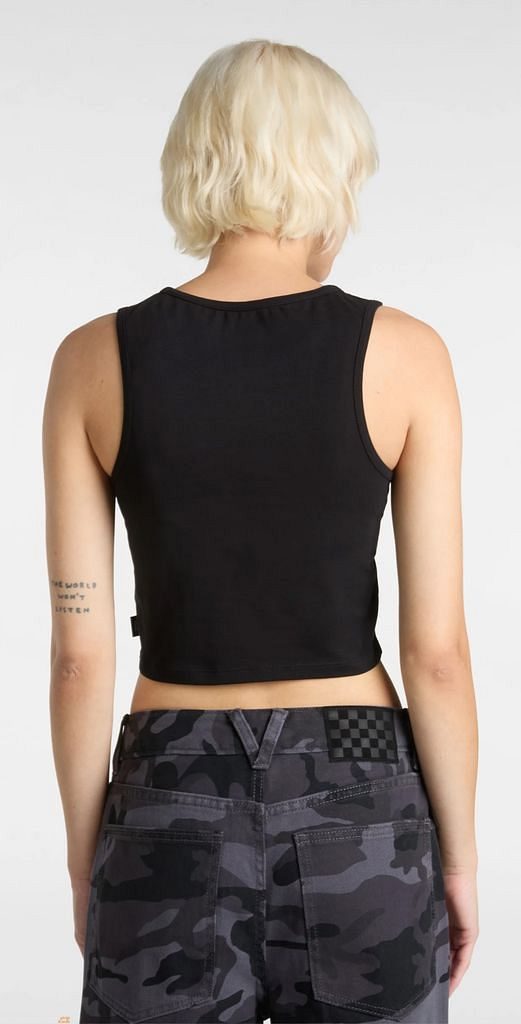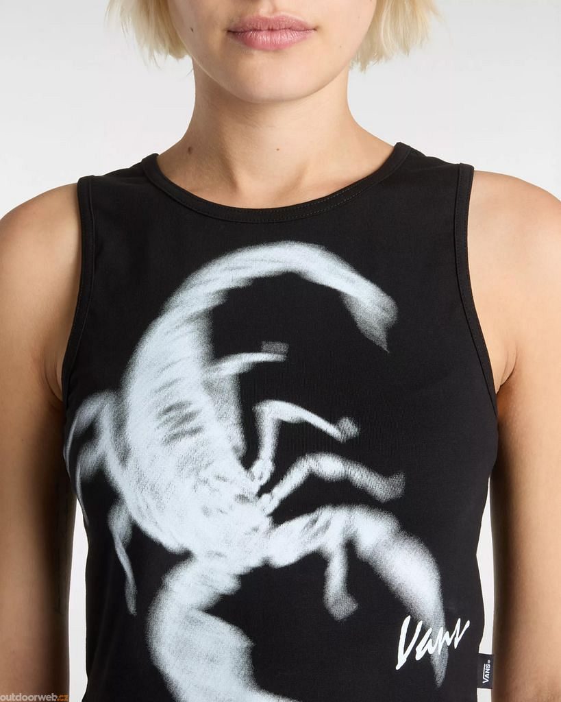 This update to the classic black tank top offers a fresh look with a little sting in the back. Our Photo Venom Tank features a full-size scorpion graphic on the front and a handwritten Vans logo in the lower right front corner for visible branding.This sleeveless tank top has a crew neck and a fitted, cropped cut for a more modern silhouette.