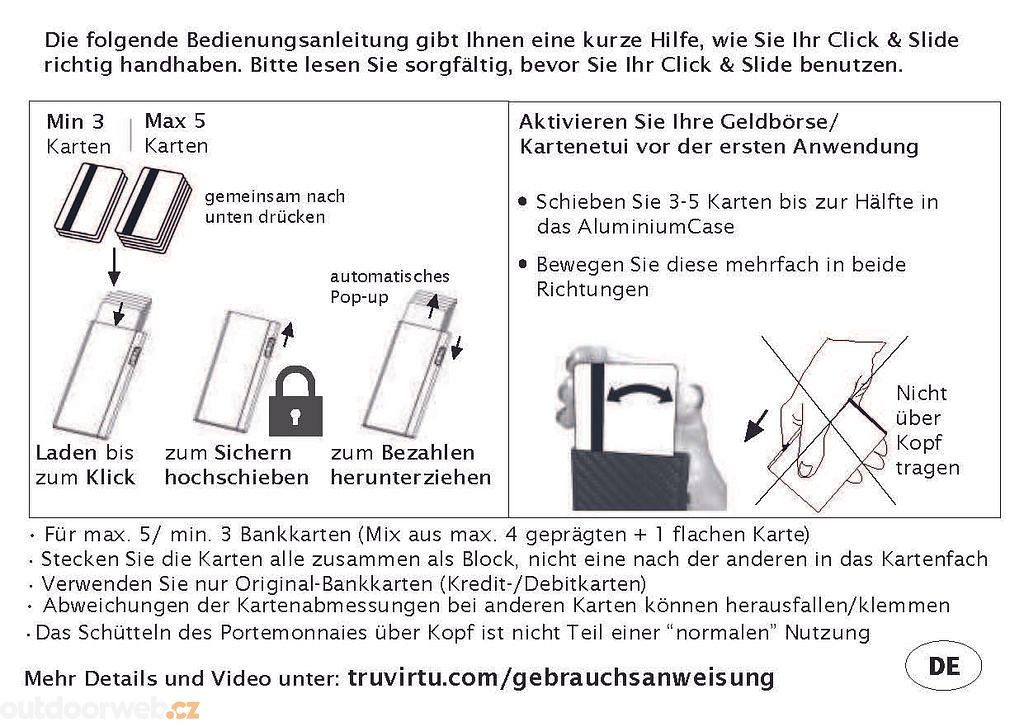 5 cards (always max. 4 embossed + 1 flat) available at the touch of a button (for the opening mechanism to work properly, the compartment needs to be filled with 5 cards). Separate opening section for banknotes and business cards, where 7 more cards can be stored if needed.